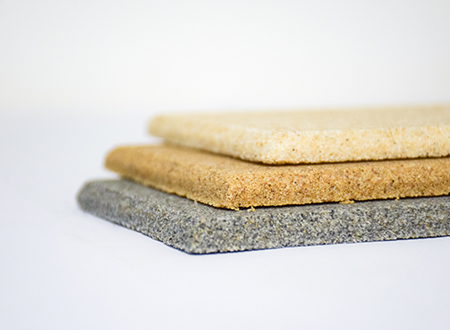 微粒材料是一種新型綠色裝飾材料,具備優(yōu)異的聲學性和物理性能。該材料是以天然砂粒或經環(huán)保處理的固廢顆粒為骨料,以環(huán)保膠凝劑,通過壓振工藝,生產的具有大量相互連通的微小空隙的多孔材料。